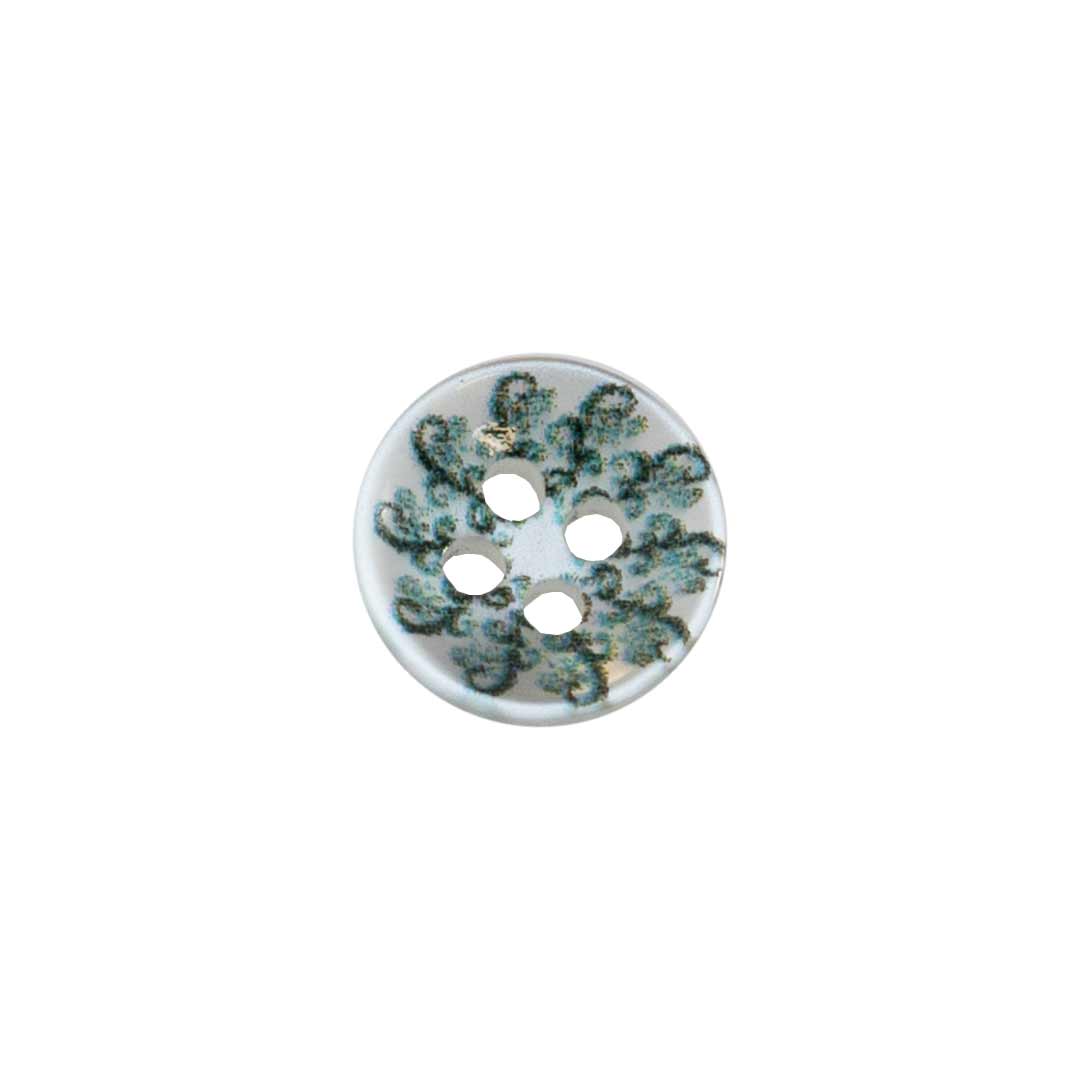 Ge dina plagg och accessoarer en elegant och unik detalj med denna vita knapp med vackert mönster i blågröna toner. Knappen har ett dekorativt mönster som påminner om bladrankor eller klassiskt paisleymönster, vilket ger ett mjukt och stilfullt intryck.
