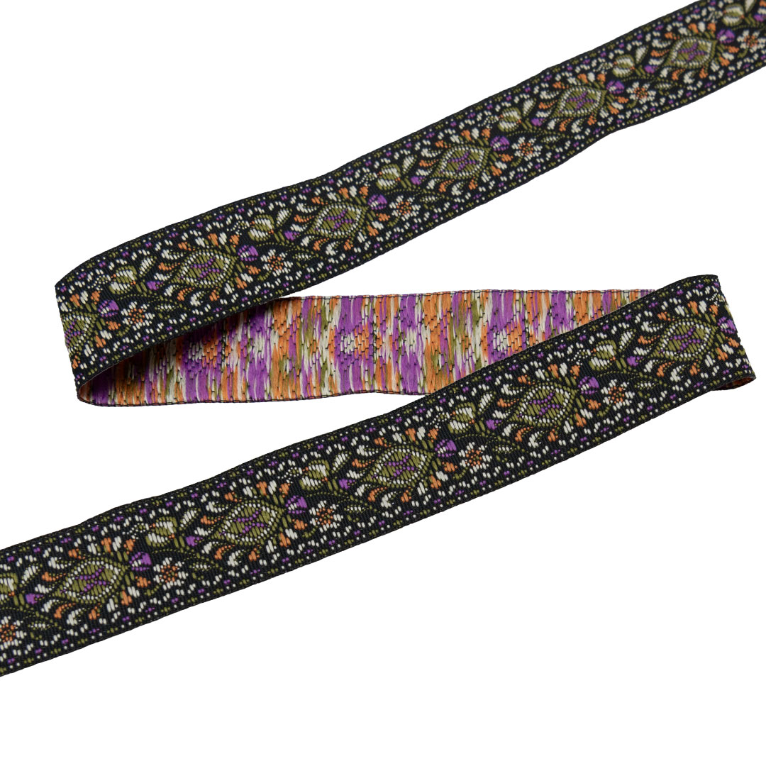 Ett vackert jacquardvävt band med ornamentmönster i grönt, orange och lila mot en svart bakgrund. Bandet är 25 mm brett och passar perfekt som dekoration på kläder, väskor, kuddar eller andra inredningsdetaljer.