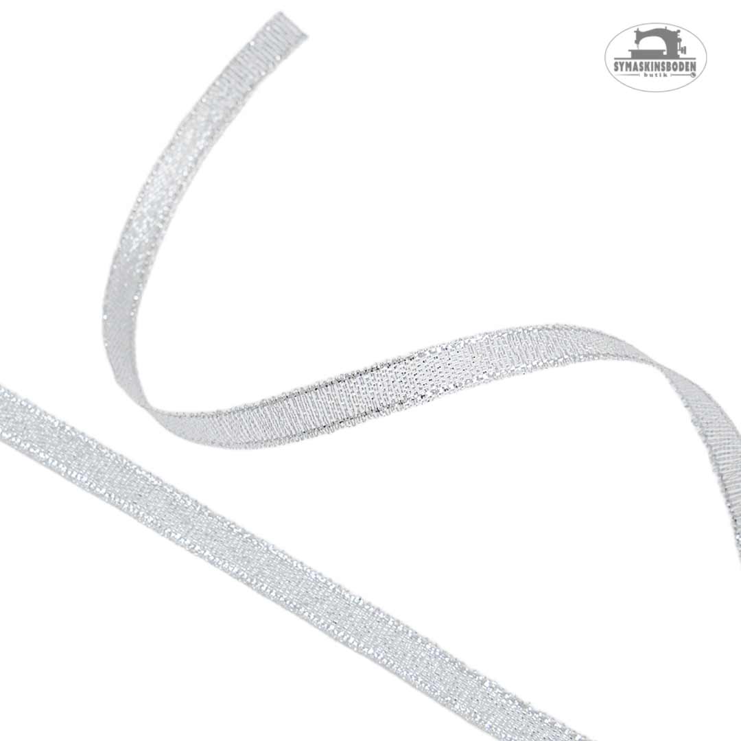 Det här fina bandet är supersnyggt att använda till rosetter, upphängning av julpynt, som servettringar och massa annat kul. Det är tunt och är lite transparent. Glittertrådarna i bandet reflekterar ljus och får bandet att glittra ännu mer! Det är stadigare än ett traditionellt satinband och håller därför formen väldigt bra.