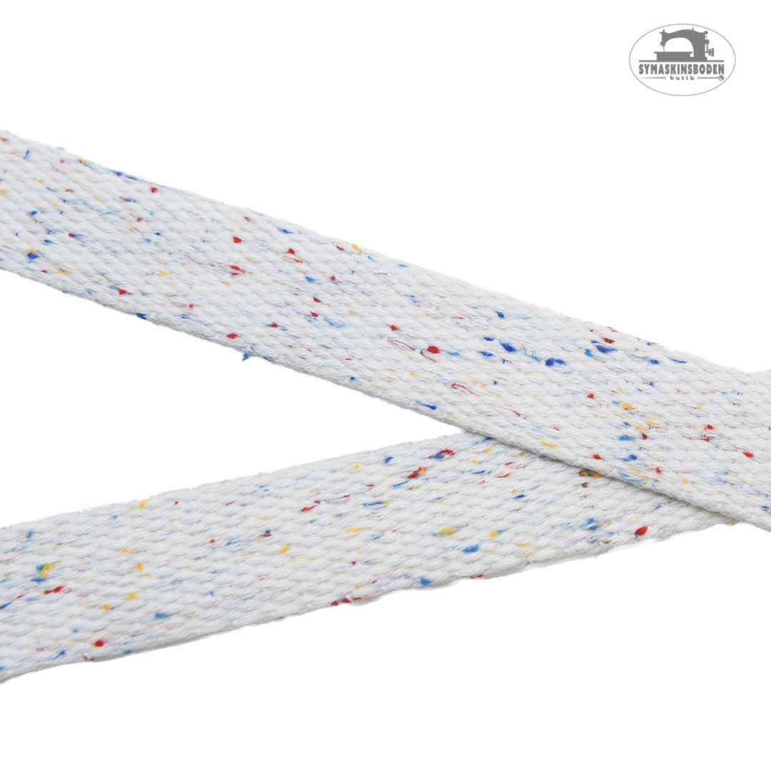 Det här snygga bandet är vävt med lite olikfärgade fibrer vilket ger det en lekfull strösseleffekt. Bottenfärgen, och den mest dominanta färgen, är vit och bandet är liksidigt samt har en fin struktur. Styrkan i bandet gör det perfekt till saker som handtag till väskor och grepp till lådor men funkar även som snygg detalj på ditt sömnadsprojekt.