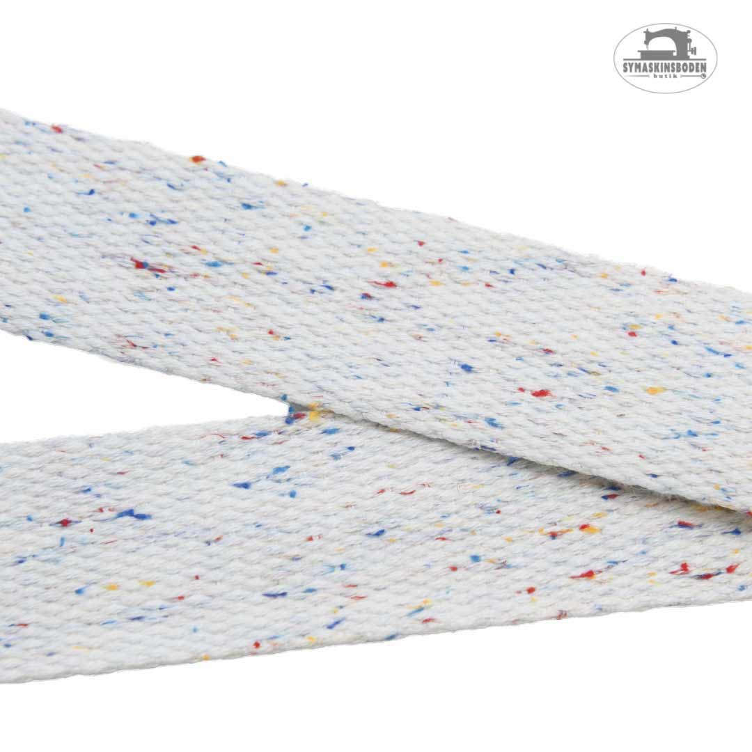 Det här snygga bandet är vävt med lite olikfärgade fibrer vilket ger det en lekfull strösseleffekt. Bottenfärgen, och den mest dominanta färgen, är vit och bandet är liksidigt samt har en fin struktur. Styrkan i bandet gör det perfekt till saker som handtag till väskor och grepp till lådor men funkar även som snygg detalj på ditt sömnadsprojekt.