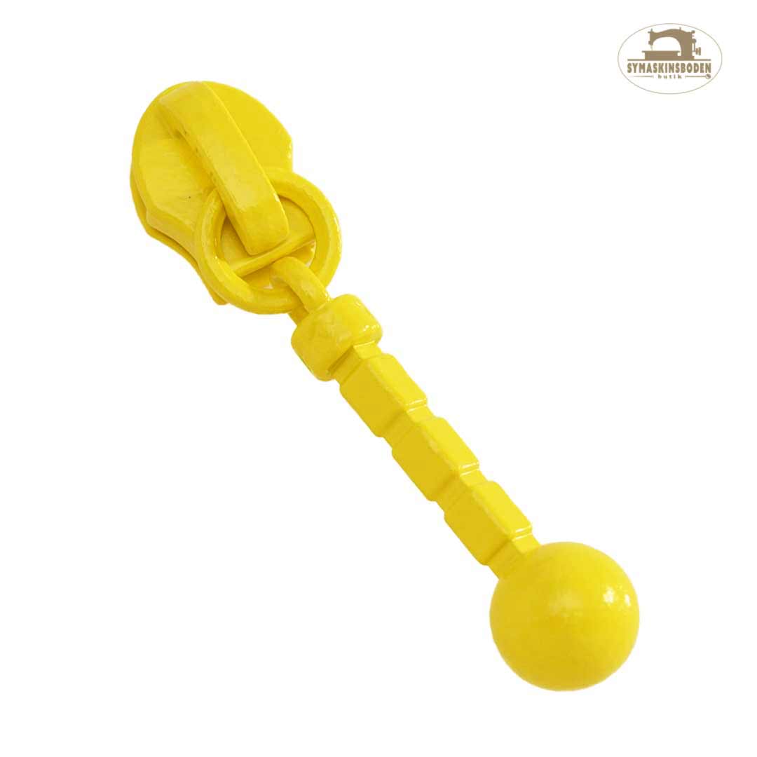 Kläpp/löpare till blixtlås på metervara med 4 mm spiral, kallas ibland storlek #3. Kläppen är rak och har en dekorativ kula längst ned. Löparen är gjord i metall och är totalt 36 mm lång mm och den raka staven är ca 20mm.