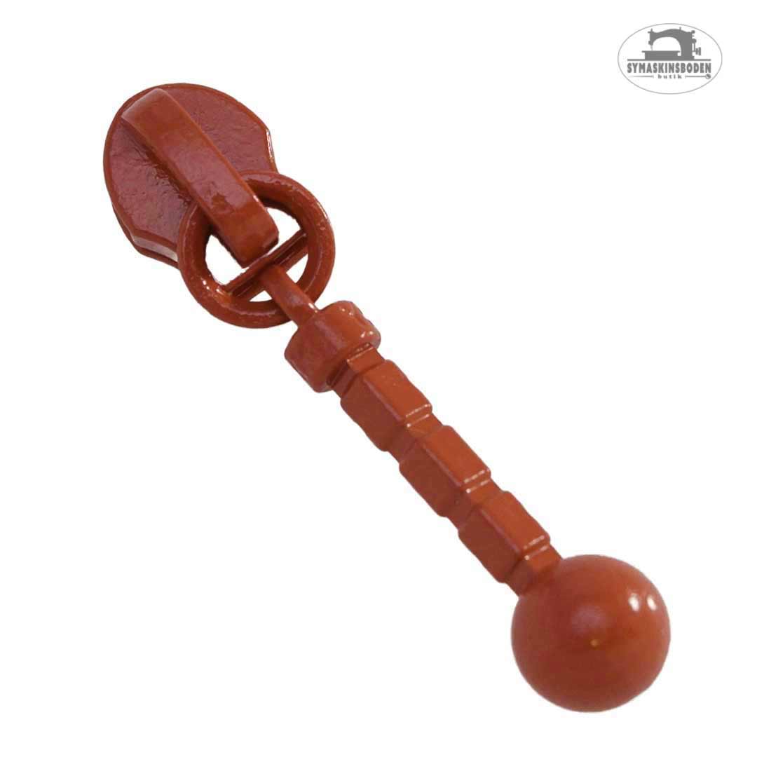 Kläpp/löpare till blixtlås på metervara med 4 mm spiral, kallas ibland storlek #3. Kläppen är rak och har en dekorativ kula längst ned. Löparen är gjord i metall och är totalt 36 mm lång mm och den raka staven är ca 20mm.