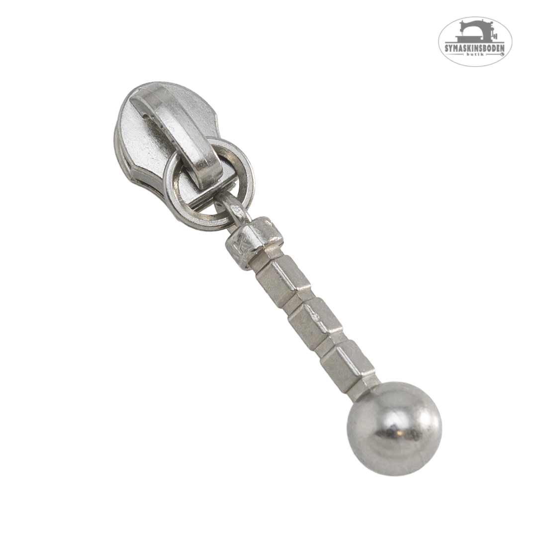 Kläpp/löpare till blixtlås på metervara med 4 mm spiral, kallas ibland storlek #3. Kläppen är rak och har en dekorativ kula längst ned. Löparen är gjord i metall och är totalt 36 mm lång mm och den raka staven är ca 20mm.