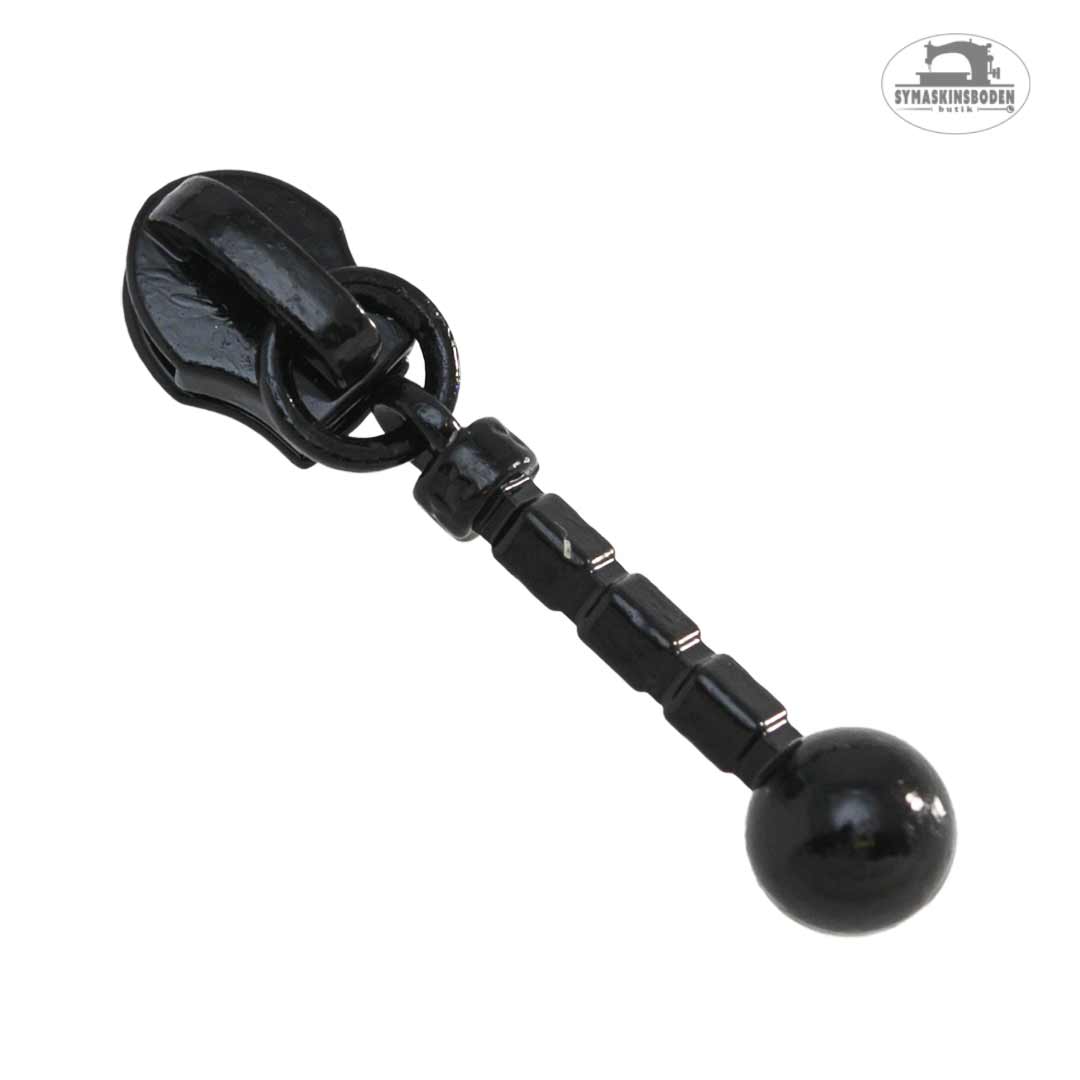 Kläpp/löpare till blixtlås på metervara med 4 mm spiral, kallas ibland storlek #3. Kläppen är rak och har en dekorativ kula längst ned. Löparen är gjord i metall och är totalt 36 mm lång mm och den raka staven är ca 20mm.