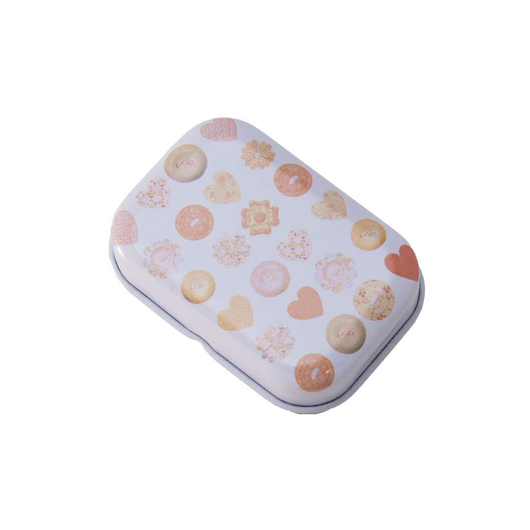 En charmig liten plåtask i aprikos med ett dekorativt knappmotiv på locket. Den har ett praktiskt gångjärnslock och är perfekt för att förvara sybehör eller andra småsaker. Asken är ca 2,5 cm hög, 5,5 cm lång och 3,8 cm bred Baksidan är enfärgad beigeaprikos.