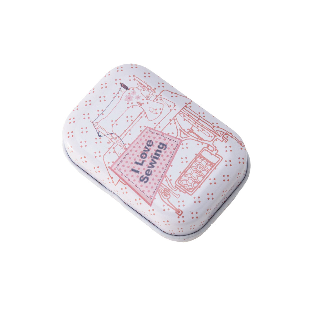 En charmig liten plåtask i rött med ett dekorativt symaskinsmotiv på locket. Den har ett praktiskt gångjärnslock och är perfekt för att förvara sybehör eller andra småsaker. Asken är ca 2,5 cm hög, 5,5 cm lång och 3,8 cm bred Baksidan är mönstrad röd.