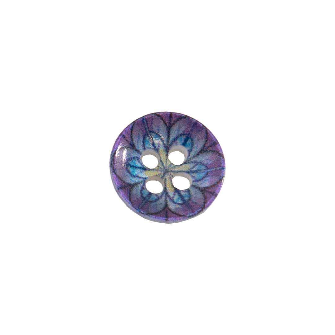 Ge dina plagg en unik och dekorativ detalj med denna knapp med vackert blommönster inspirerat av målat glas. Knappen är lätt transparent med vit baksida, vilket ger ett mjukt ljusspel och framhäver de fina färgerna i lila, blått och inslag av gult.