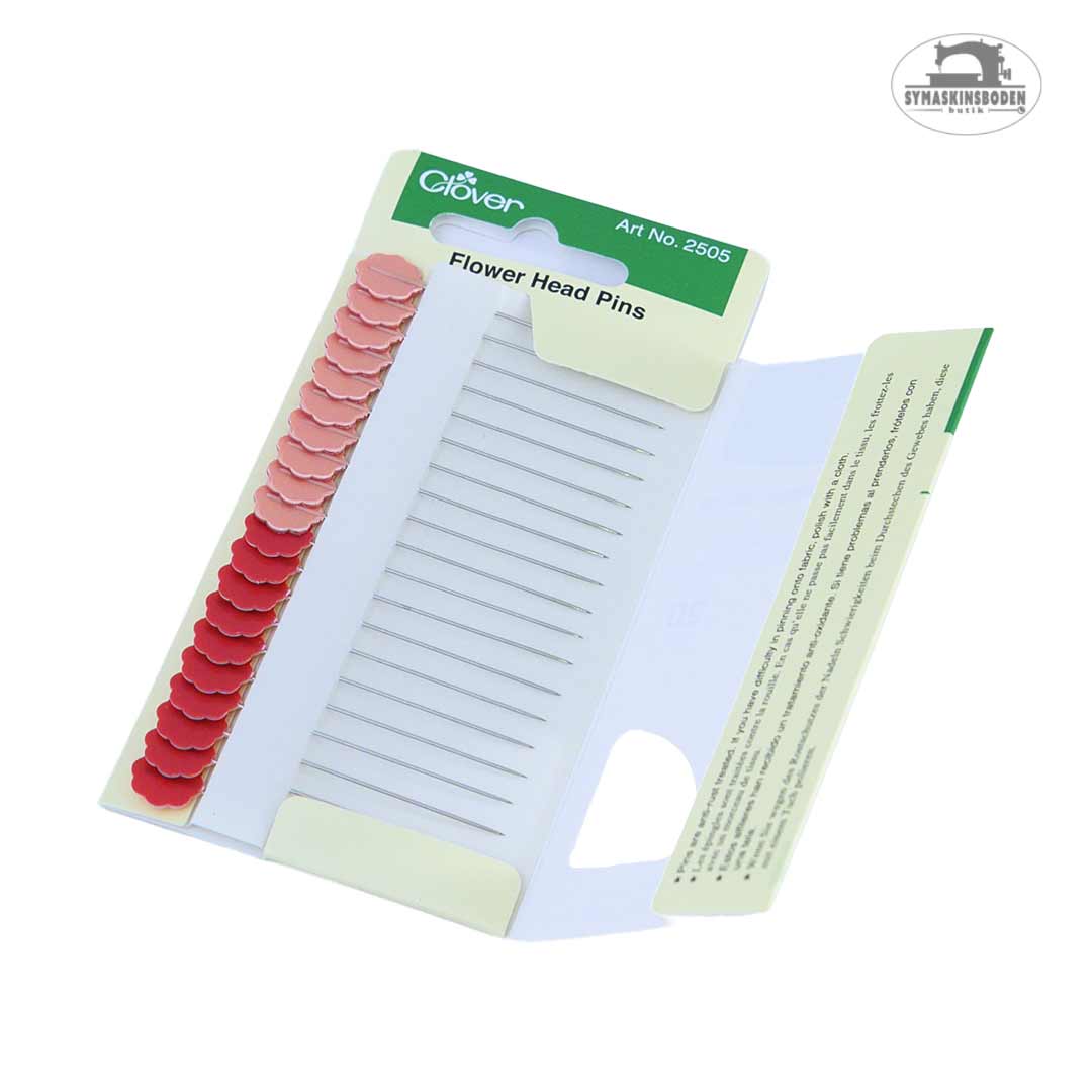 En förpackning med 20st knappnålar som är 0,55 mm i diameter och 50 mm i längd. Hälften har aprikos blomknopp och de andra har röd blomknopp. Blomman är platt och det är därför enkelt att ha kvar nålarna i tyget medan du syr. Knappnålarna är också gjorda för att vara enkla att hålla i.