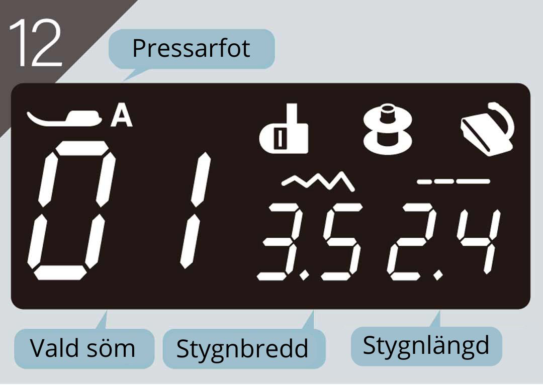 På displayen visas sömnummer, stygnbredd- och längd, rekommenderad pressarfot och en del annan information.