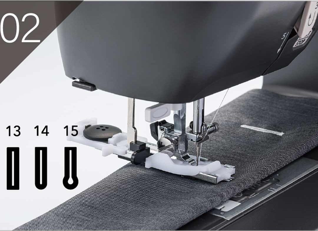 Placera knappen i den medföljande pressarfoten så får du perfekta knapphål sydda efter knappens storlek, i ett enda steg.