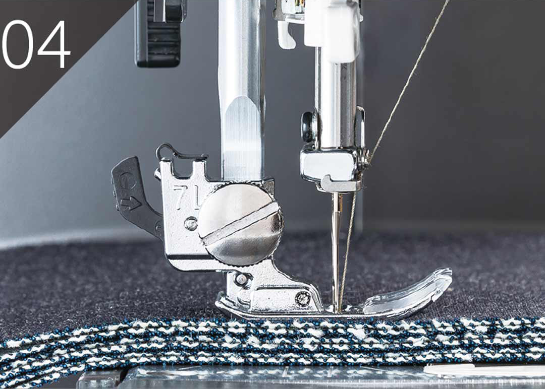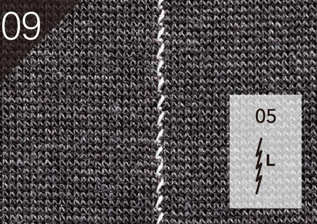 Den vänsterställda elastiska sömmen för ihopsömnad förhindrar att tyg fastnar i stygnplåten. Den är högelastiskt och passar stickade tyger.