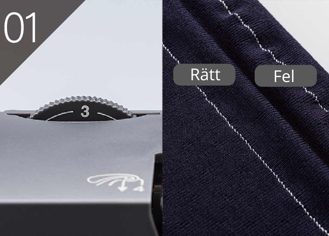 Justera pressarfotstrycket för att få en snygg finish i det material du skall sy i. Rätt tryck ger en slät yta som inte töjer ut sig. Sänk trycket vid många lager tyg.