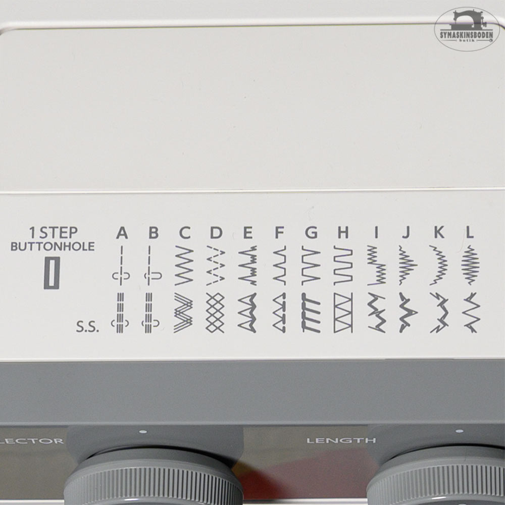 22 nyttosömmar, elastiska sömmar och dekorativa sömmar.