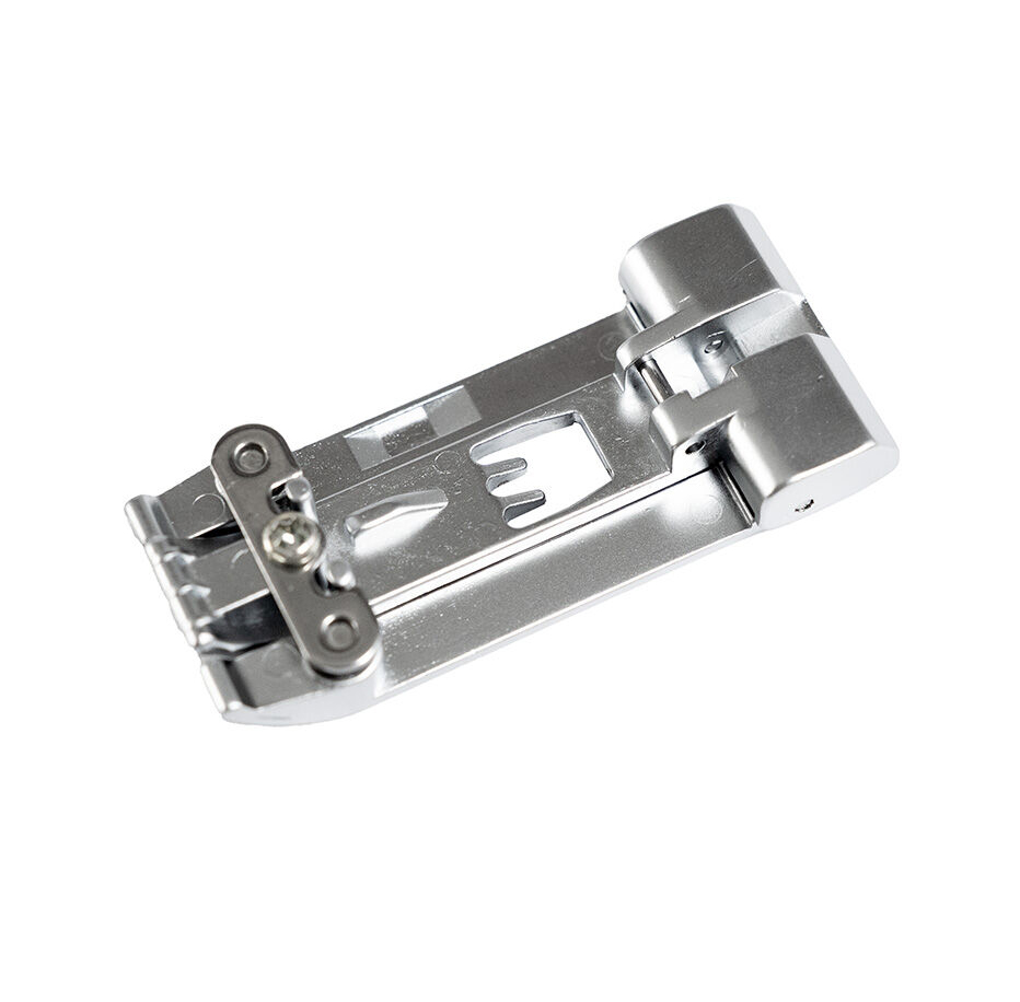 Den kompenserande pressfoten är ett mekaniskt precisionsverktyg utformat för att lösa den vanligaste utmaningen vid coverstitch-sömnad: ojämna tyglager. Genom en tredelad konstruktion (vänster, center, höger) och oberoende fjäderupphängning fram och bak, anpassar sig foten efter materialets struktur. Detta säkerställer en jämn matning och stygnbildning även när du syr över sömmar eller fållar där tygtjockleken varierar kraftigt.