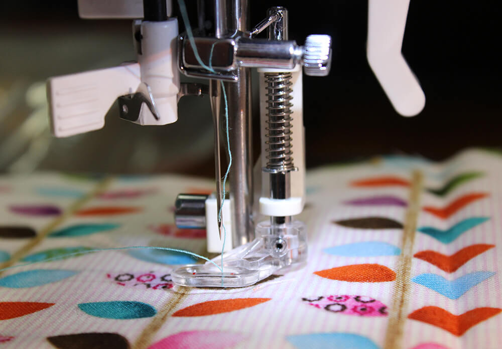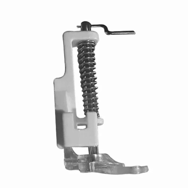 Pressarfoten är fjädrande med nålens rörelse upp och ner. Med mataren nedfälld så är det du som bestämmer tygets förflyttning med dina händer. Pressarfoten är transparent för bättre synlighet och den är stängd för att inte riskera att trådarna hamnar utanför och trasslar in sig.