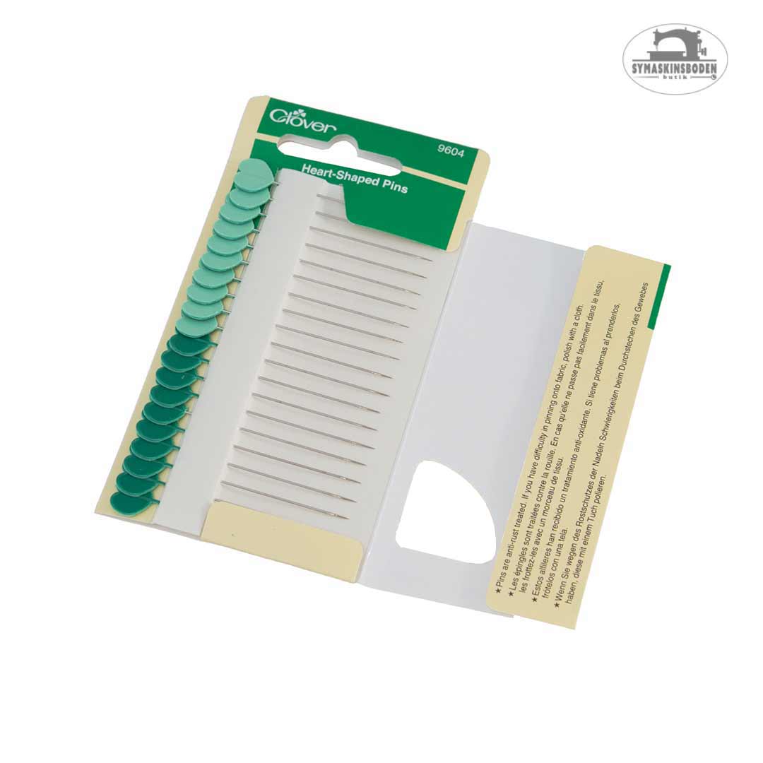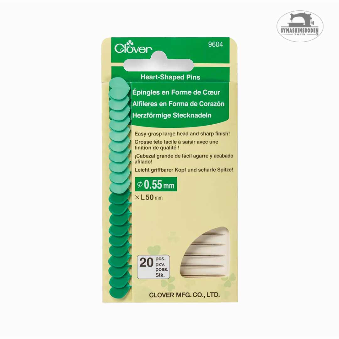 En förpackning med 20st knappnålar som är 0,55 mm i diameter och 50 mm i längd. Hälften har ljusgrönt hjärta som knopp och de andra har ett grönt hjärta som knopp. Hjärtat är platt och det är därför enkelt att ha kvar nålarna i tyget medan du syr. Knappnålarna är också gjorda för att vara enkla att hålla i.
