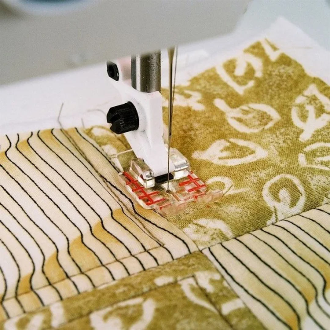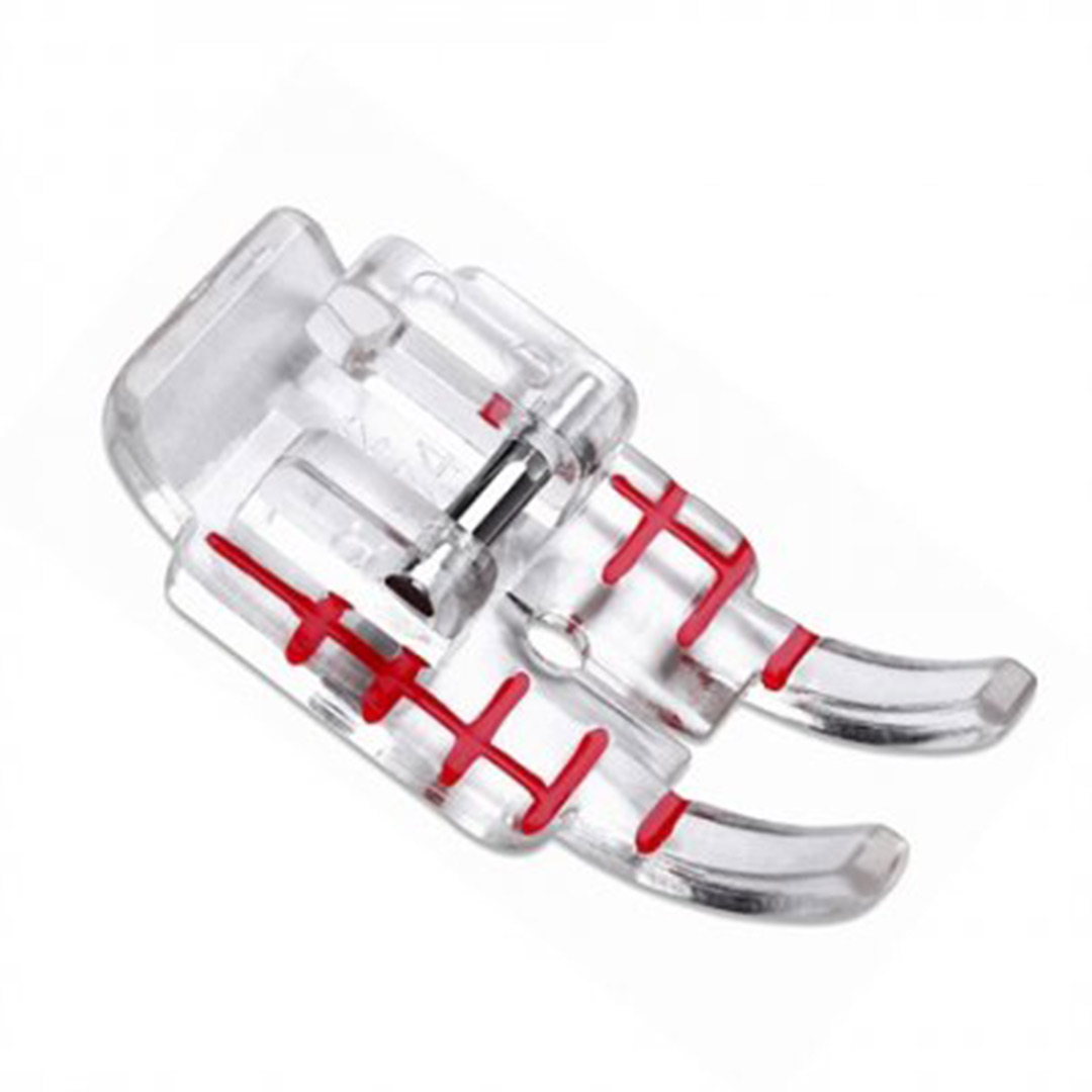Transparent quiltfot i plast för bättre synlighet med röda avståndsmarkeringar för 1/4" (6mm) och 1/8" (3mm) De röda markeringarna hjälper dig att rikta in tyget i början av sömnaden, i hörnen och i slutet av tyget.