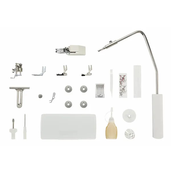 Standardutrustning: Raksömsfot, fållfot (2 mm), syguide, knälyft, Jumbo-spolar i metall och nålar.