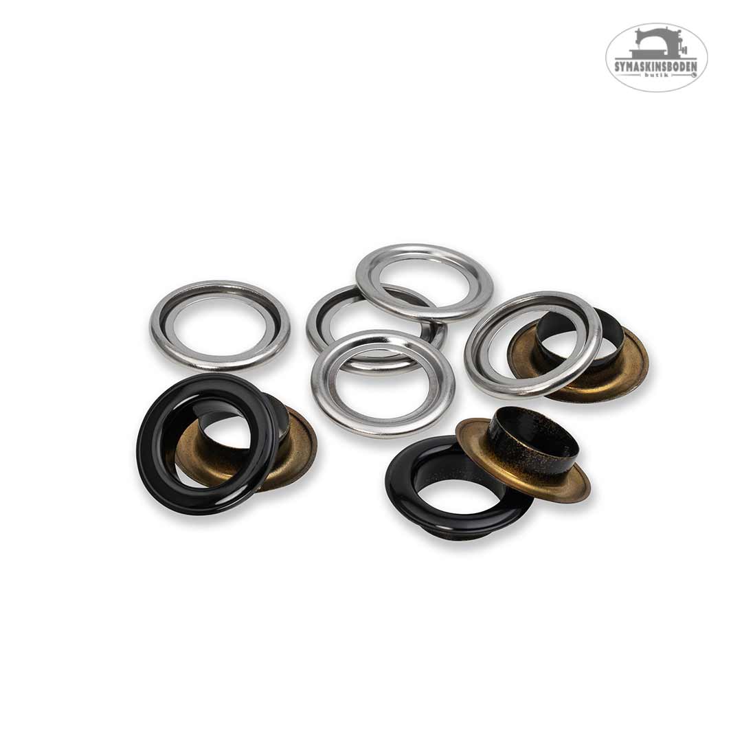 Öljetter med 11 mm diameter i svart till Vario Creative Tool. Öljetter används för att förstärka hål på textilier som kläder, väskor, inredning och mycket mer. Tillverkade i rostfri mässing. Baksidan av öljetterna är silverfärgade.