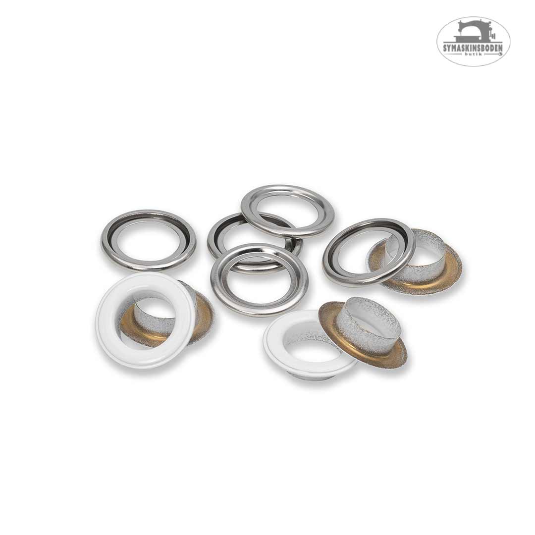 Öljetter med 11 mm diameter i vitt till Vario Creative Tool. Öljetter används för att förstärka hål på textilier som kläder, väskor, inredning och mycket mer. Tillverkade i rostfri mässing. Baksidan av öljetterna är silverfärgade.