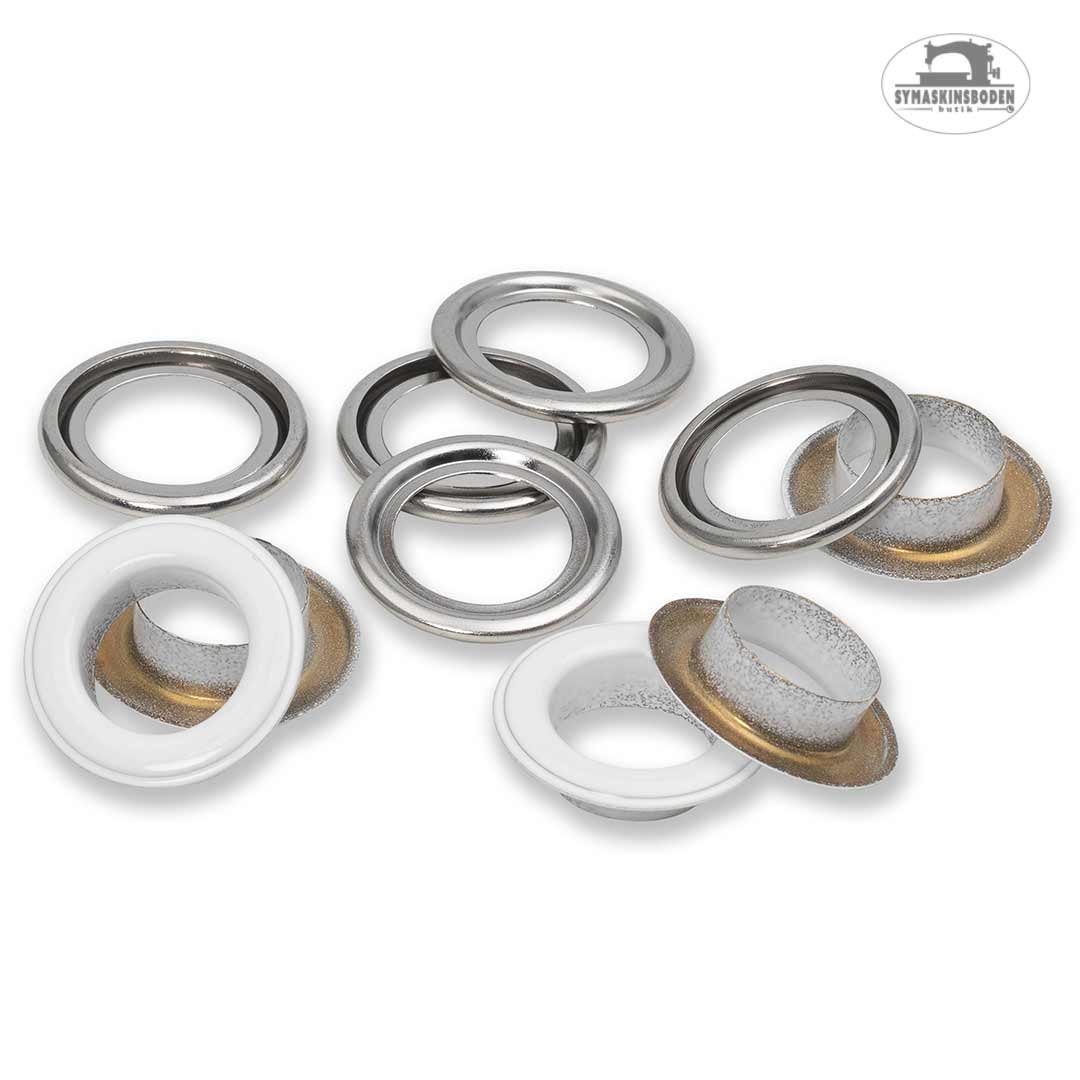 Öljetter med 14 mm diameter i vitt till Vario Creative Tool. Öljetter används för att förstärka hål på textilier som kläder, väskor, inredning och mycket mer. Tillverkade i rostfri mässing. Baksidan av öljetterna är silverfärgade.