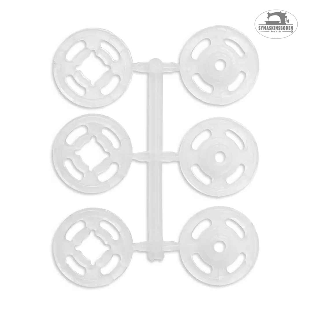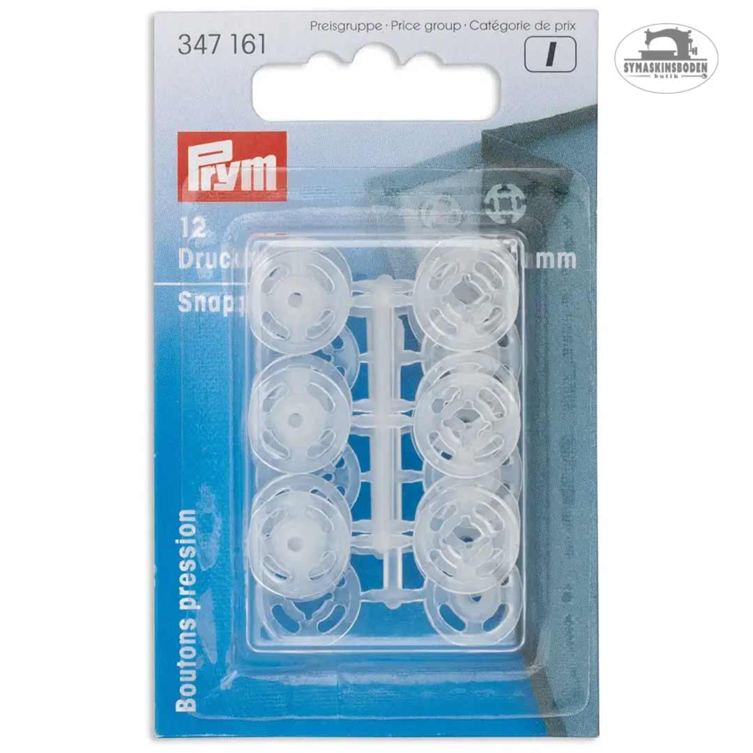 12 tryckknappar i genomskinlig plast som du syr fast för hand. Knapparna kan tvättas i 95 grader, tål torktumlare på mellanvärme samt försiktig pressning med medelvarmt strykjärn.