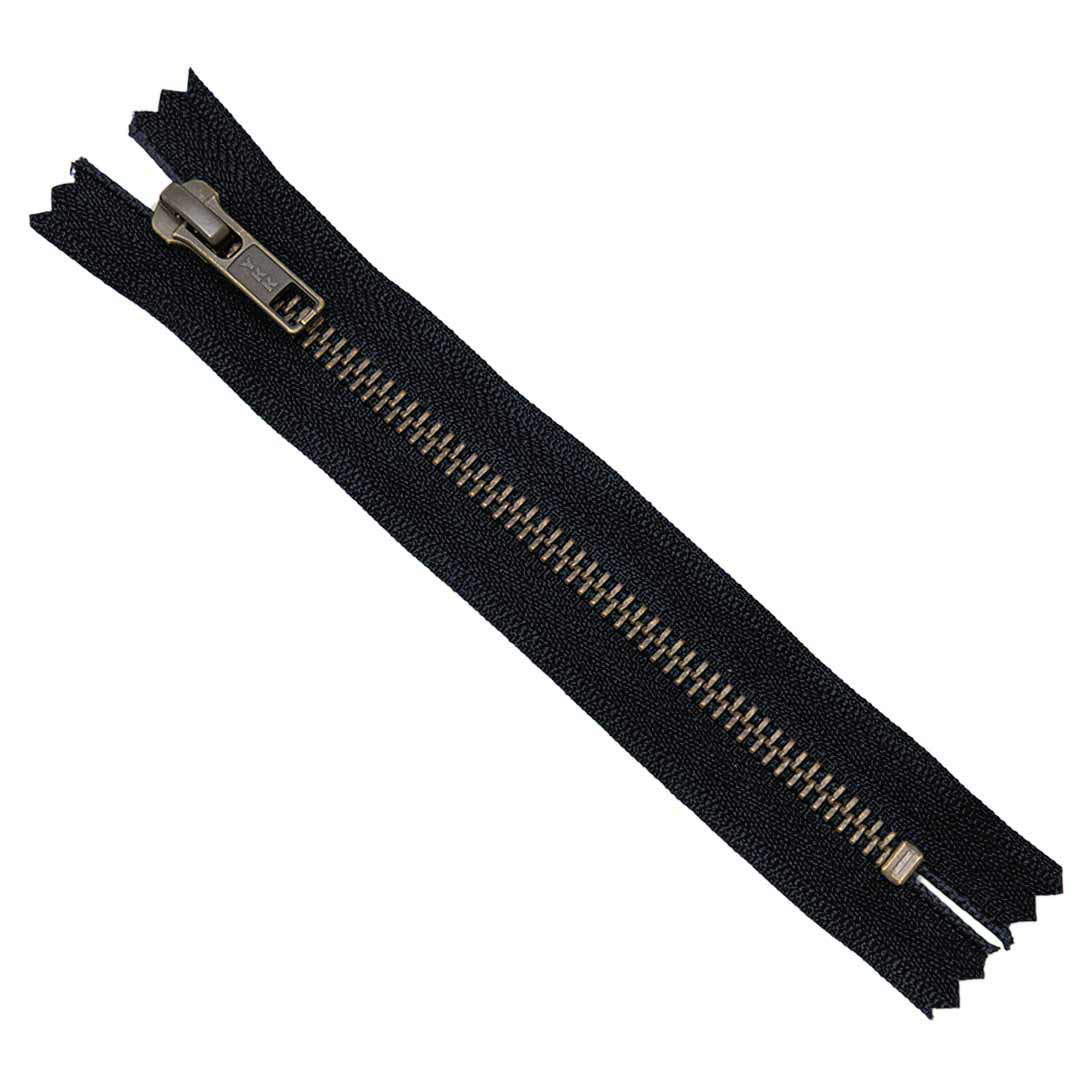 En 15 cm lång dragkedja med tänder i metall som oftast används till gylf i byxor eller kjol. Bandet på dragkedjan är svart och tänderna har färgen antikmässing.